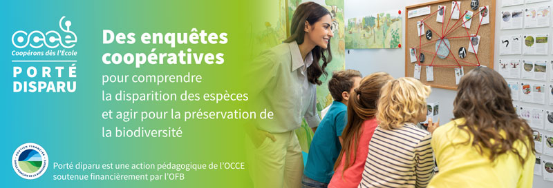 L’OCCE se mobilise pour sensibiliser les élèves des cycles 3 et 4 au déclin sans précédent de la biodiversité. Il met à disposition des enseignants l'outil pédagogique Porté disparu pour aborder cette problématique dans une vision scientifique et systémique. L’objectif est de permettre aux élèves de découvrir les cinq facteurs directs de changement affectant la nature et de comprendre quels leviers actionner pour y remédier. Porté disparu a reçu le soutien de l’OFB (Office Français de la Biodiversité).